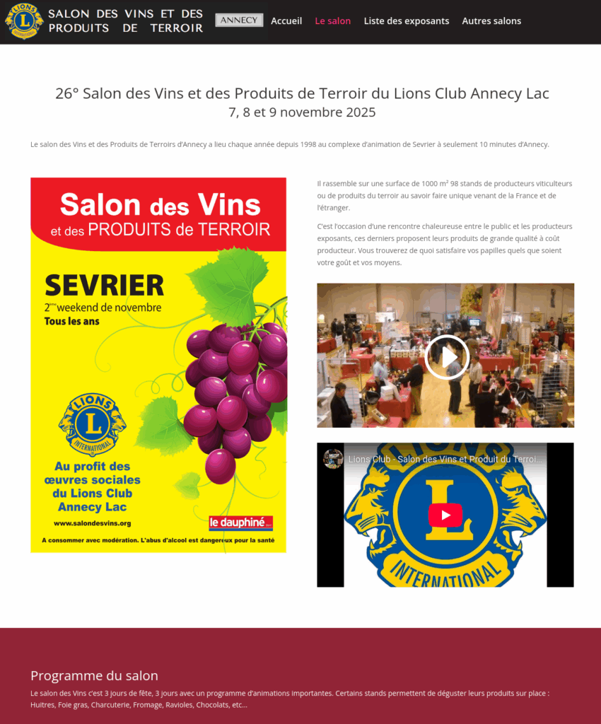 Depuis 1998, le Lions Club d’Annecy Lac organise un événement qui a su conquérir le cœur des amateurs de vin et de produits du terroir : le Salon des Vins. Ce rendez-vous annuel, festif et convivial, est devenu au fil des années un incontournable de la région et bien au-delà.